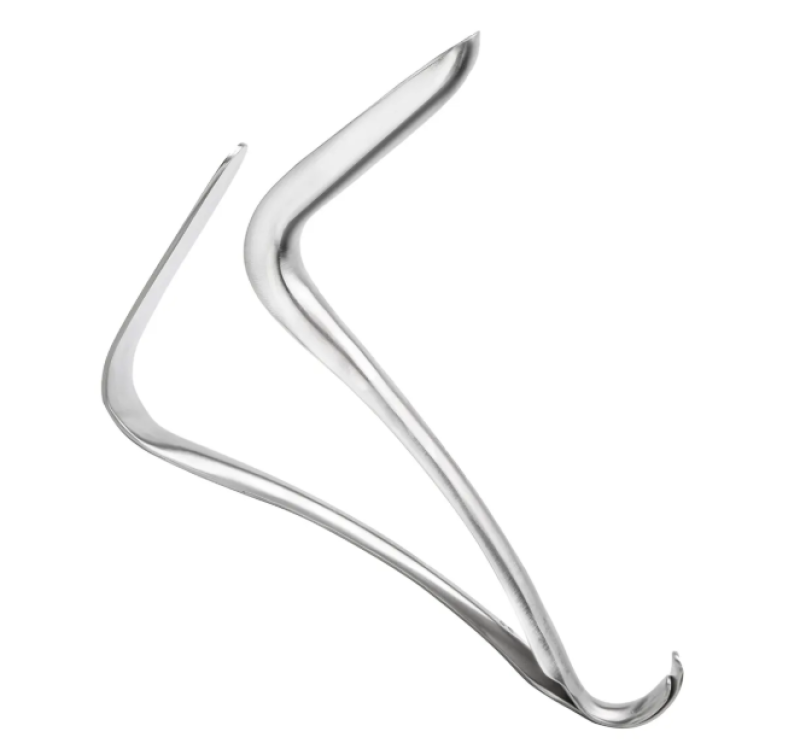 The Kristeller vaginal speculum consists of two parts: one with a semicircular blade (speculum) and one with a flat blade (holder). The parts are assembled and inserted, after which they can be easily positioned correctly.