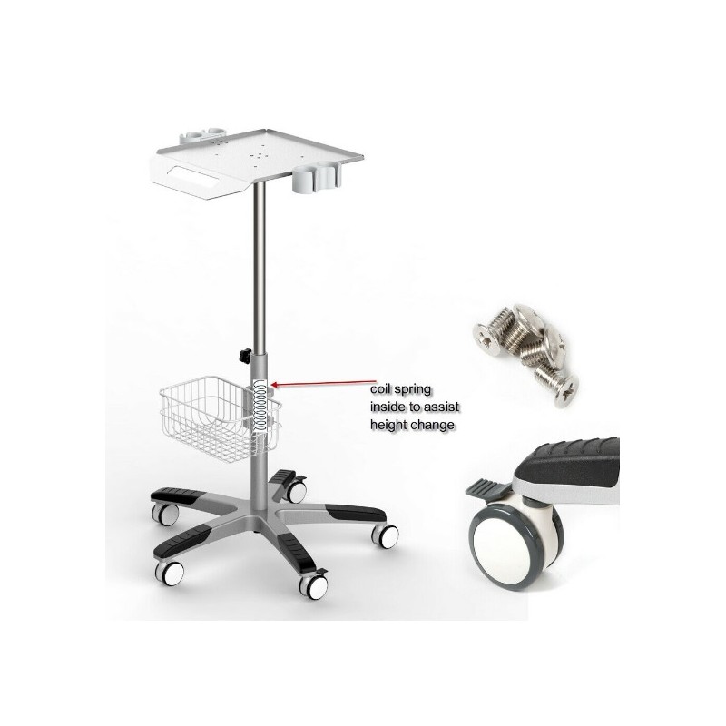 1. Constructed of sturdy aluminum alloy. 42 x 40 cm large stainless steel top plate for storage: Doppler machine, monitors, EKG machine, defibrillator, patient monitor, ultrasound scanner, etc.